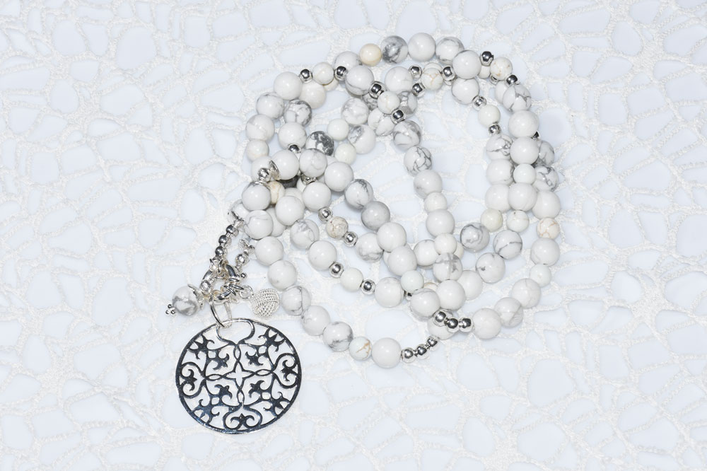 Halskette aus 6 mm und 8 mm grossen Howlithsteinen mit Silberelementen. Der Howlith bestärkt Selbstständigkeit und regt an sein Leben selbst zu gestalten. Der wunderschöne Ornament-Anhänger hängt an einem Federringverschluss mit zwei zusätzlichen kleinen Kugelanhängern. Alle Silberteile sind aus 925 Silber. Die Länge der Kette ist ca. 92 cm. Alle Anhänger können auch beliebig gewechselt werden.