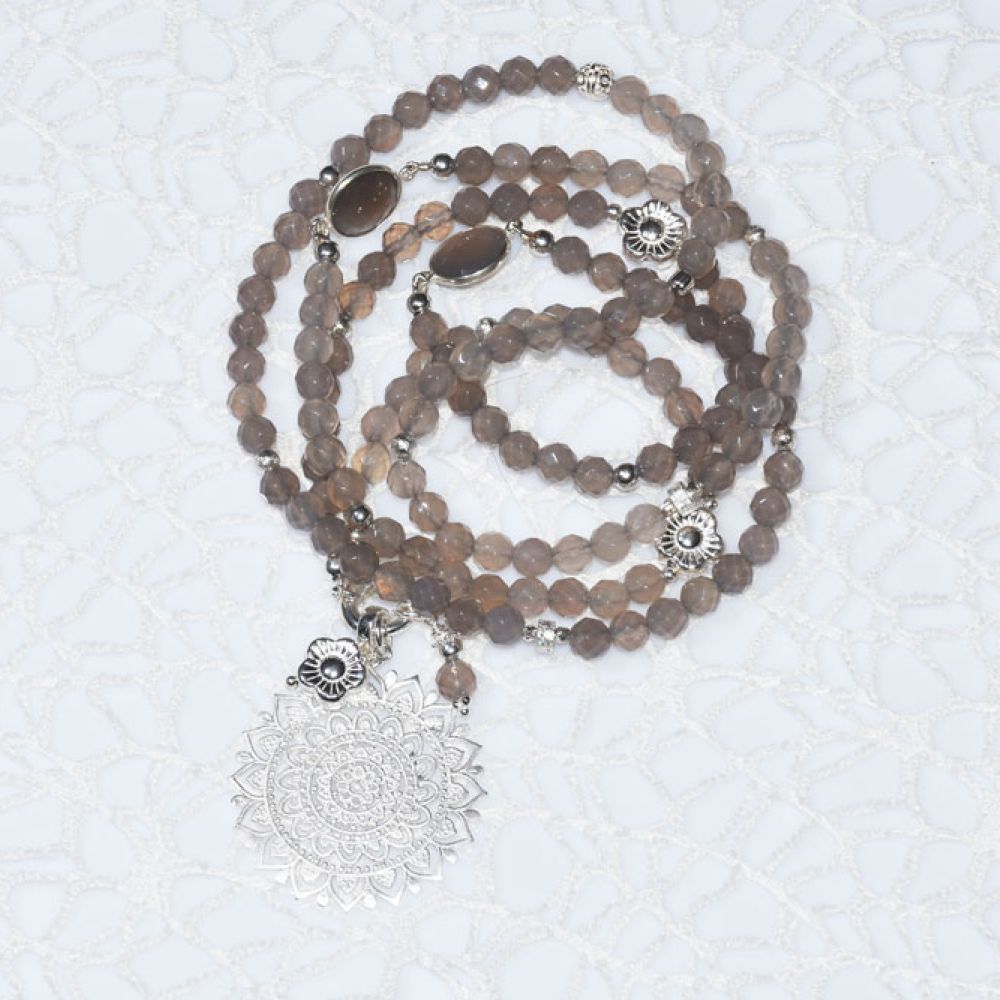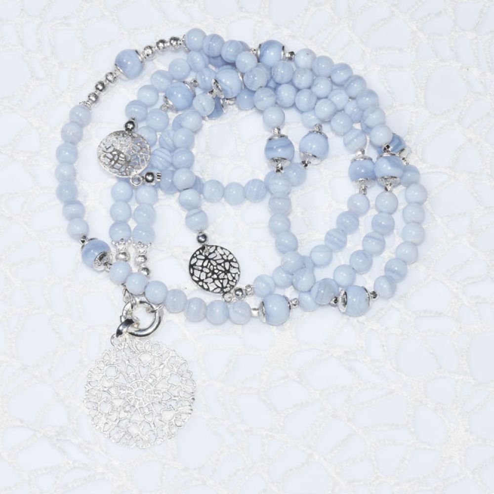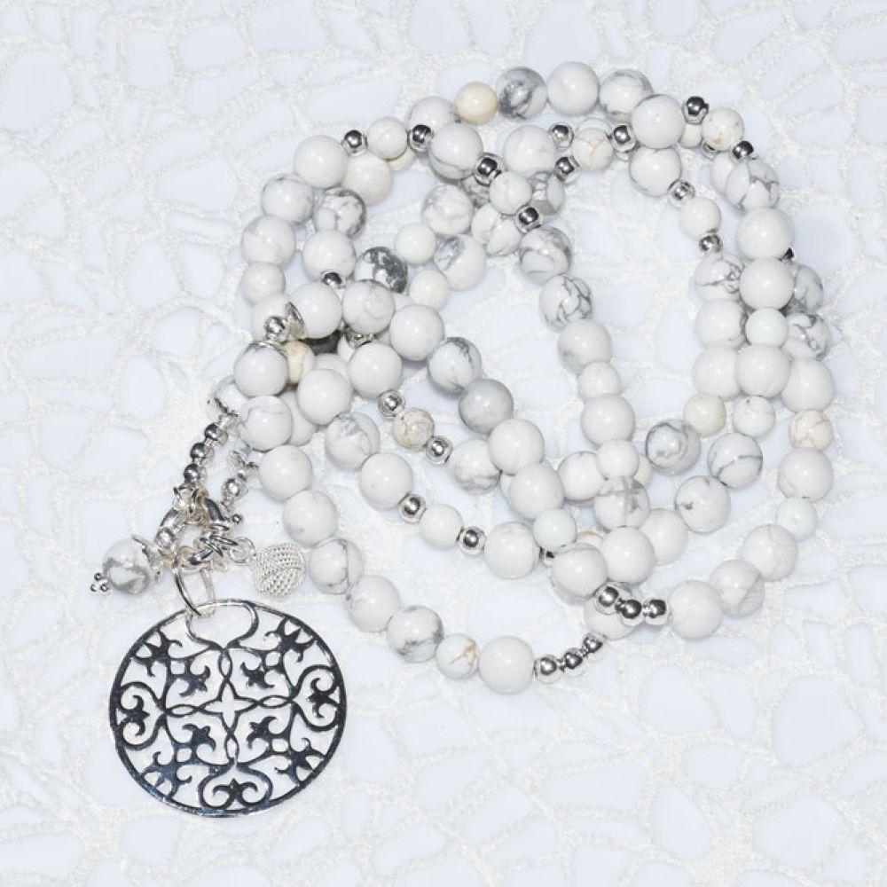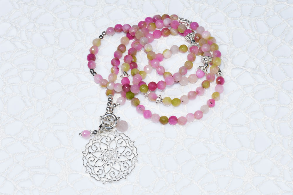 Diese Halskette aus rund facetiert eingefärbten Serpentinsteinen, welche Stress und Anspannung lindert, hat einen Federringverschluss mit einem wunderschönen Ornament-Anhänger aus 925 Silber und verschiedene Silberelemente. Die Steine haben eine Grösse von 6 mm und die Gesamtlänge beträgt ca. 84 cm. Der Anhänger kann beliebig gewechselt werden.