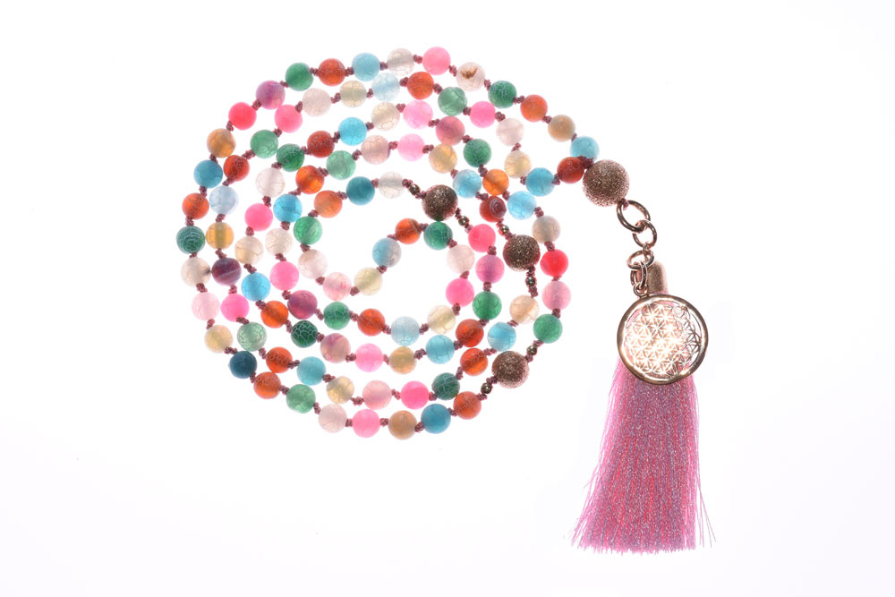 Diese Mala besteht aus 108 Perlen mit verschieden farbigen Achaten. Die Guruperle sowie die Zwischenperlen sind aus verrotgoldetem Silber. Den Abschluss ziehrt eine Blume des Lebens und eine Quaste aus Seide.