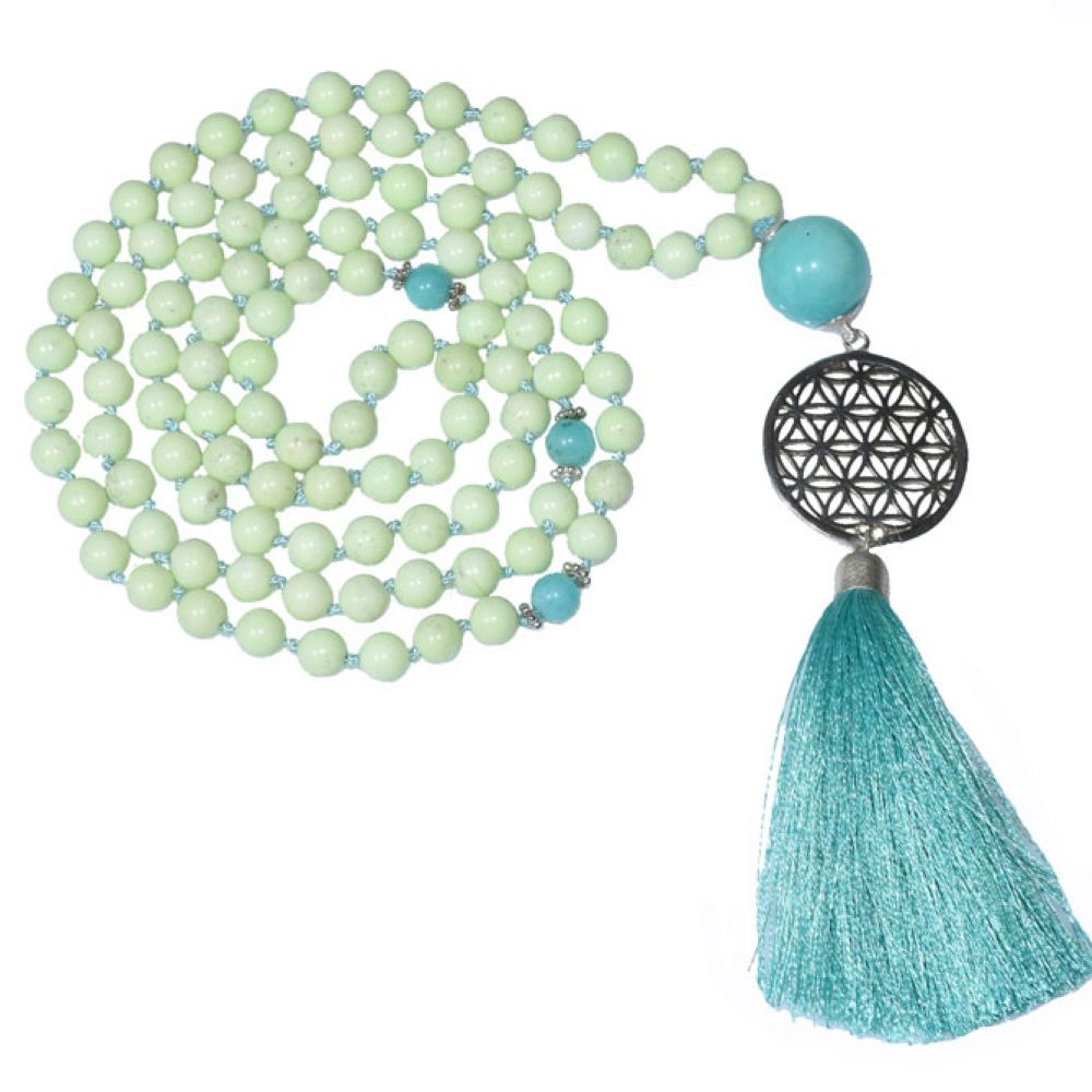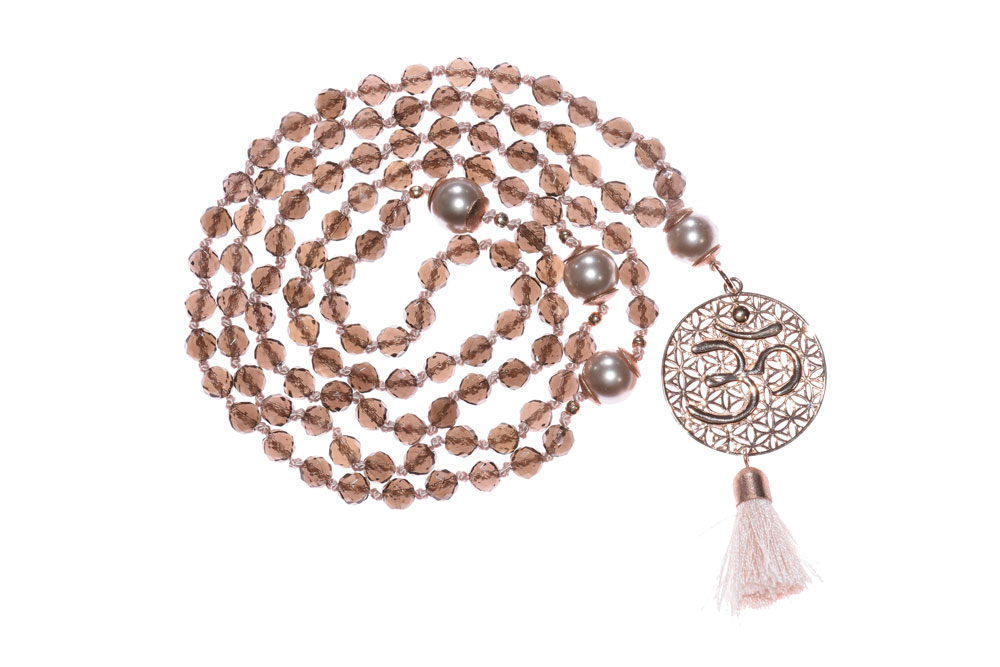 Mala Kette mit 108 Rauchquarzperlen, die Zwischenperlen und die Guruperle sind aus Muschelkern. Der Anhänger besteht aus der Blume des Lebens mit OM Zeichen darauf und ist aus verrotgoldetem Silber sowie auch die restlichen Zwischenteile. Den Abschluss bildet eine Quaste aus Seide.