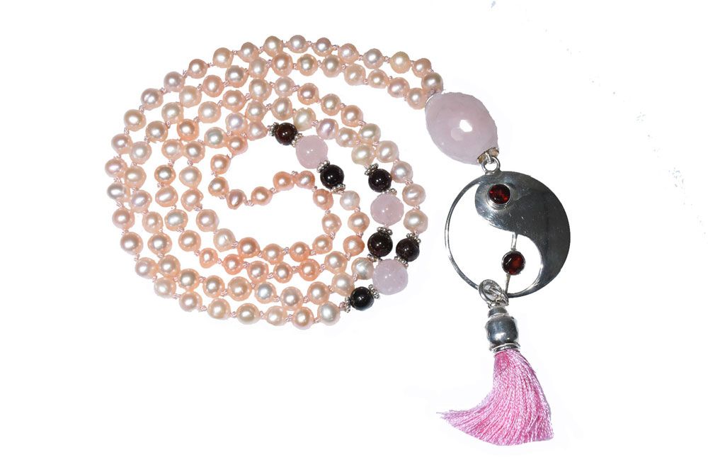 Diese Mala ist gefertigt aus 108 Süsswasserperlen, die Guruperle ist aus Rosenquarz, die Zwischenteile aus Silber, Rosenquarz und Granat. Der Abschluss besteht aus einem Yin und Yang Anhänger und einer Seidenquaste.
