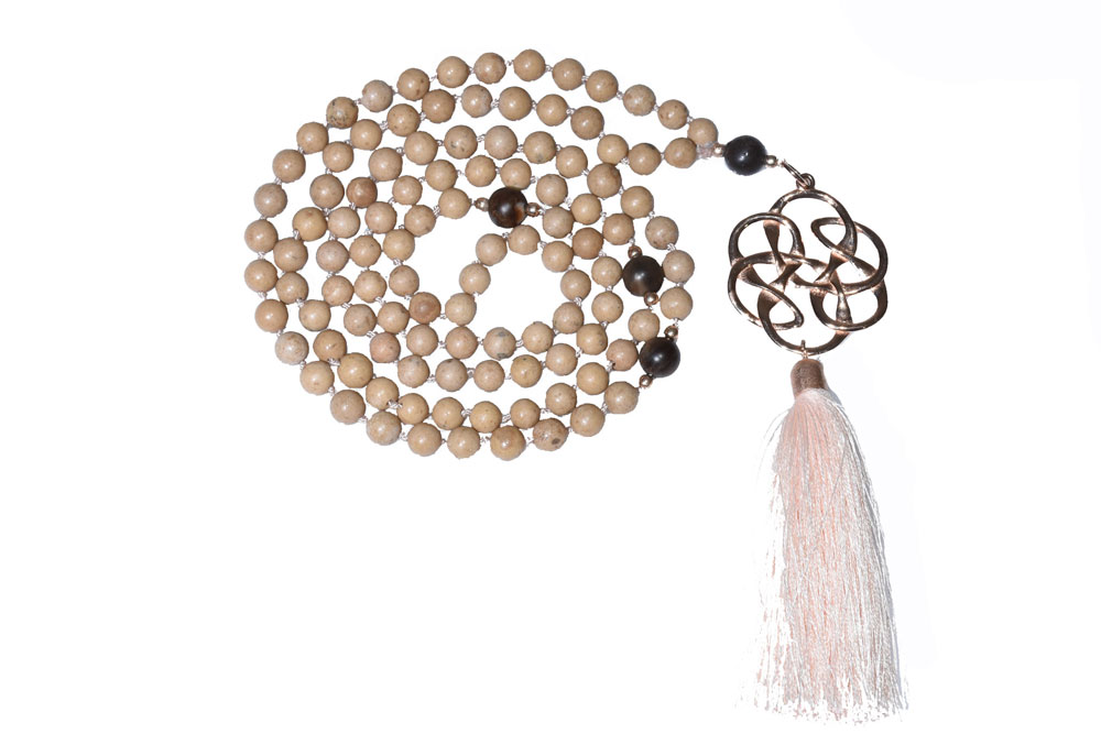 Diese Mala Kette besteht aus 108 Perlen aus versteinertem Holz mit einem verrotgoldetem Endlosknoten und einer Quaste aus Seide.